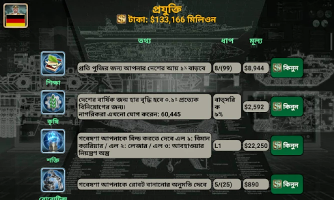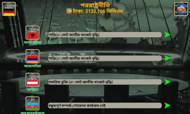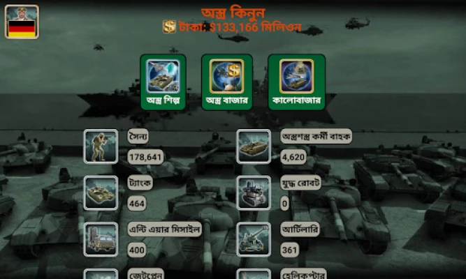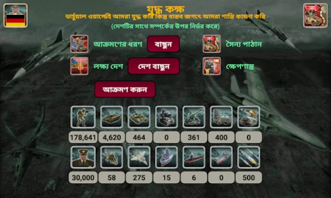 এই গেমটিতে আপনার পছন্দের দেশকে বেছে নিয়ে তার লাগাম হাতে নিন। কূটনীতি থেকে শুরু করে ভয়াবহ যুদ্ধক্ষেত্র পর্যন্ত, প্রতিটি কৌশল আপনার নখদর্পণে থাকবে। আন্তর্জাতিক অস্ত্র সরবরাহকারী, সুসংগঠিত গোয়েন্দা কেন্দ্র, যুদ্ধকক্ষ এবং জাতিসংঘে আপনার কূটনীতির প্রভাব বিস্তার করুন। অর্থনীতির চাকা ঘোরান, অত্যাধুনিক প্রযুক্তির গবেষণা করুন এবং বিশ্ব সংবাদে আপনার প্রভাব লক্ষ্য করুন – যেখানে আপনার অর্থনৈতিক পদক্ষেপ, সম্পর্ক, গুপ্তচরবৃত্তি ও যুদ্ধের গতিপ্রকৃতি প্রতিফলিত হবে। সৈনিক, ট্যাংক, ফাইটার জেট, সাবমেরিন, এমনকি অত্যাধুনিক রোবট ও ড্রোন – আপনার সাম্রাজ্যকে অপ্রতিদ্বন্দ্বী করে তুলতে সকল প্রকার সামরিক সরঞ্জাম আপনার অধীনে থাকবে। এখানে কৃত্রিম বুদ্ধিমত্তা এতই উন্নত যে প্রতিটি সিদ্ধান্তই একটি নতুন চ্যালেঞ্জ তৈরি করবে।